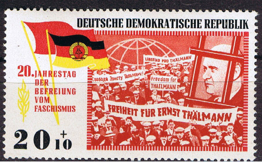 Das Motiv der Marke stellt die internationalen Proteste dar,nach dem Teddy (Spitzname von Thälmann)am 3.März 1933 von der Polizei im Auftrag der NSDAP nach derer Machtergreifung festgenommen wurde.
