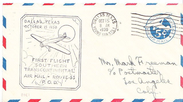 Erstflugbelege scheinen nicht mehr "in" zu sein, wenn der letzte Beitrag im Thema mehr als 13 Jahre zurück liegt. Hoffentlich hier noch nicht gezeigt : eine USA-Flugpostganzsache, benutzt am 15. Oktober 1930 in Dallas (Texas) für den Erstflug der Southern Transcontinental auf der Postroute 33. https://www.aerodacious.com/ccCAM033.HTM