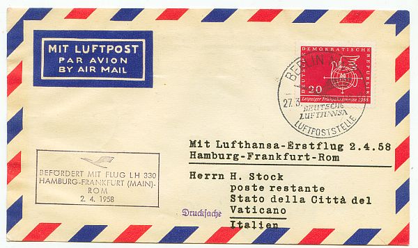 Wäre interessant, wie man das damals gemacht hat - einen Brief aus (Ost-) Berlin so zeitlich passend an den Vatikan zu schicken, dass der den Lufthansa-Erstflug von Hamburg nach Rom erwischt...