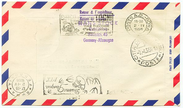 Wäre interessant, wie man das damals gemacht hat - einen Brief aus (Ost-) Berlin so zeitlich passend an den Vatikan zu schicken, dass der den Lufthansa-Erstflug von Hamburg nach Rom erwischt...