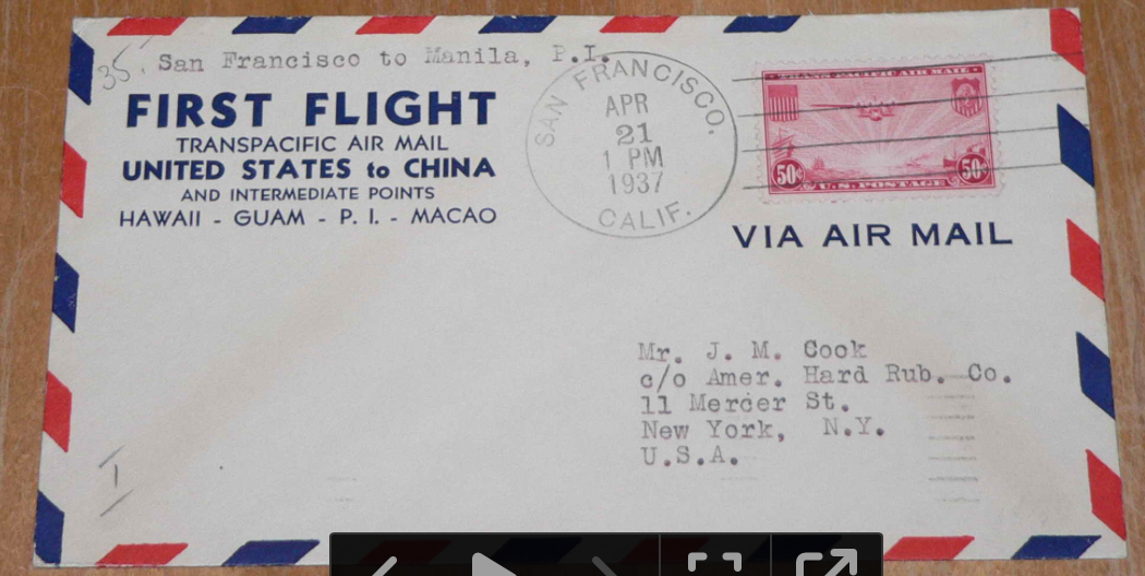 Erstflug 1937 aus den USA nach China (allerdings mit Zwischenstationen : dieser Brief ging nach Manila).