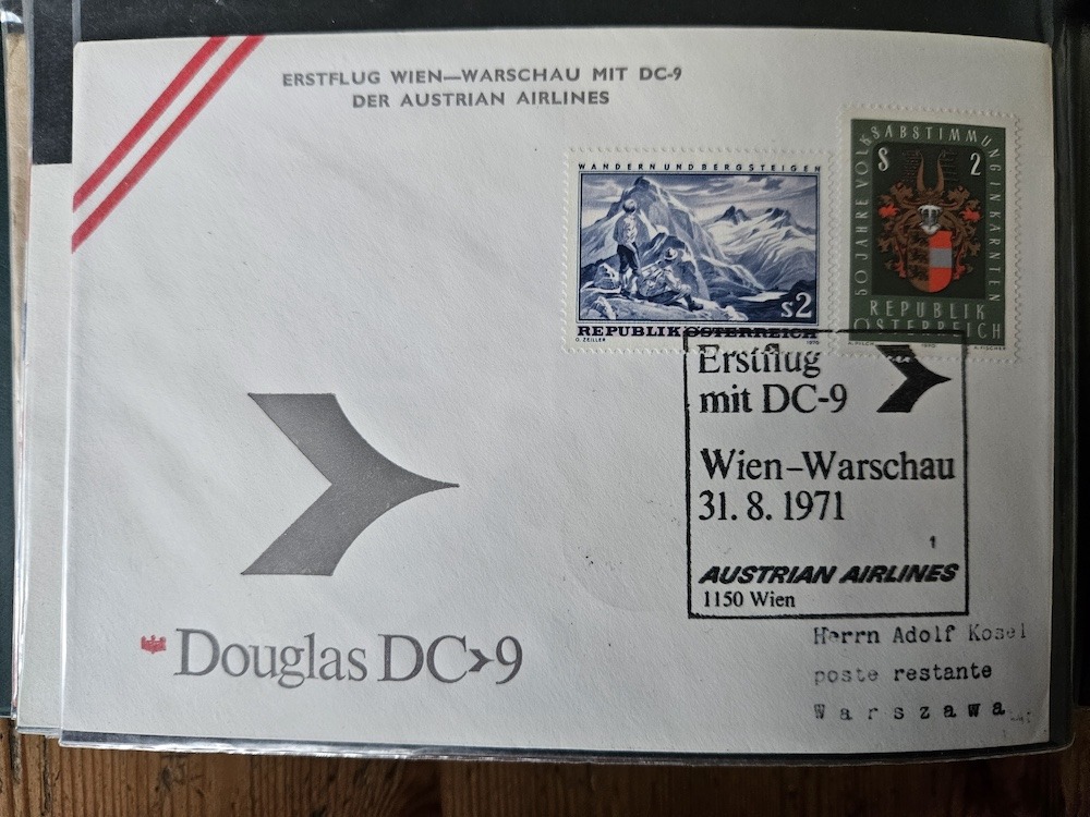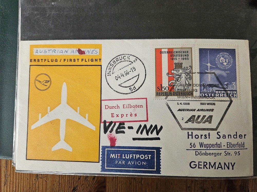 Hier zwei Erstflüge der Austrian Airlines, Innsbruck-London sowie Wien-Mailand, beide an den Bundesminister Proksch adressiert.