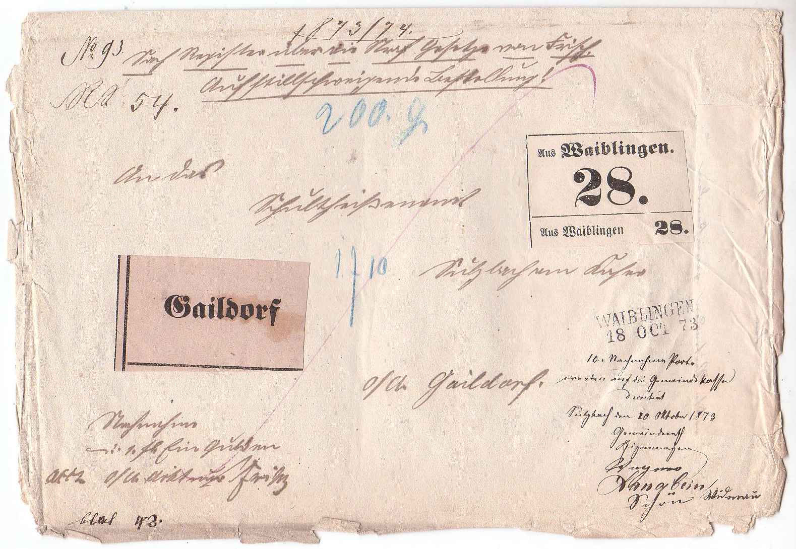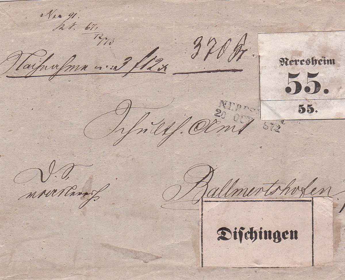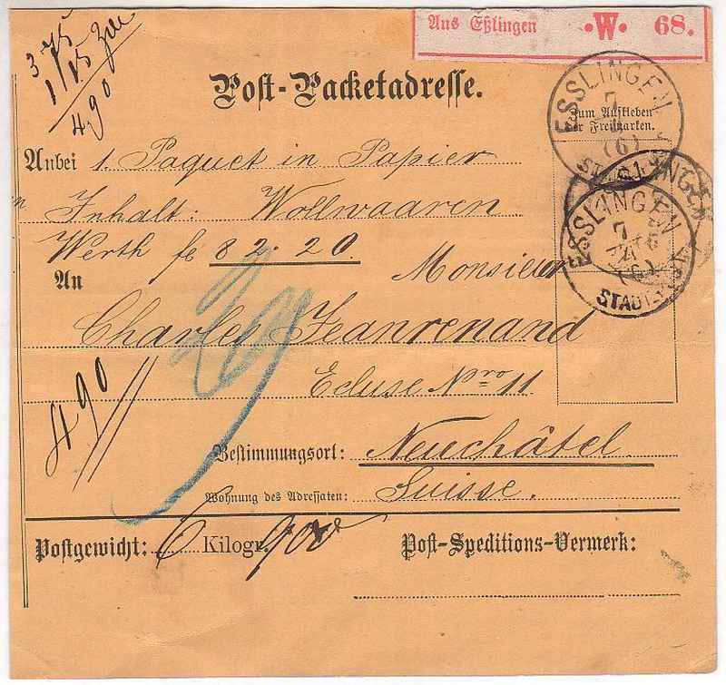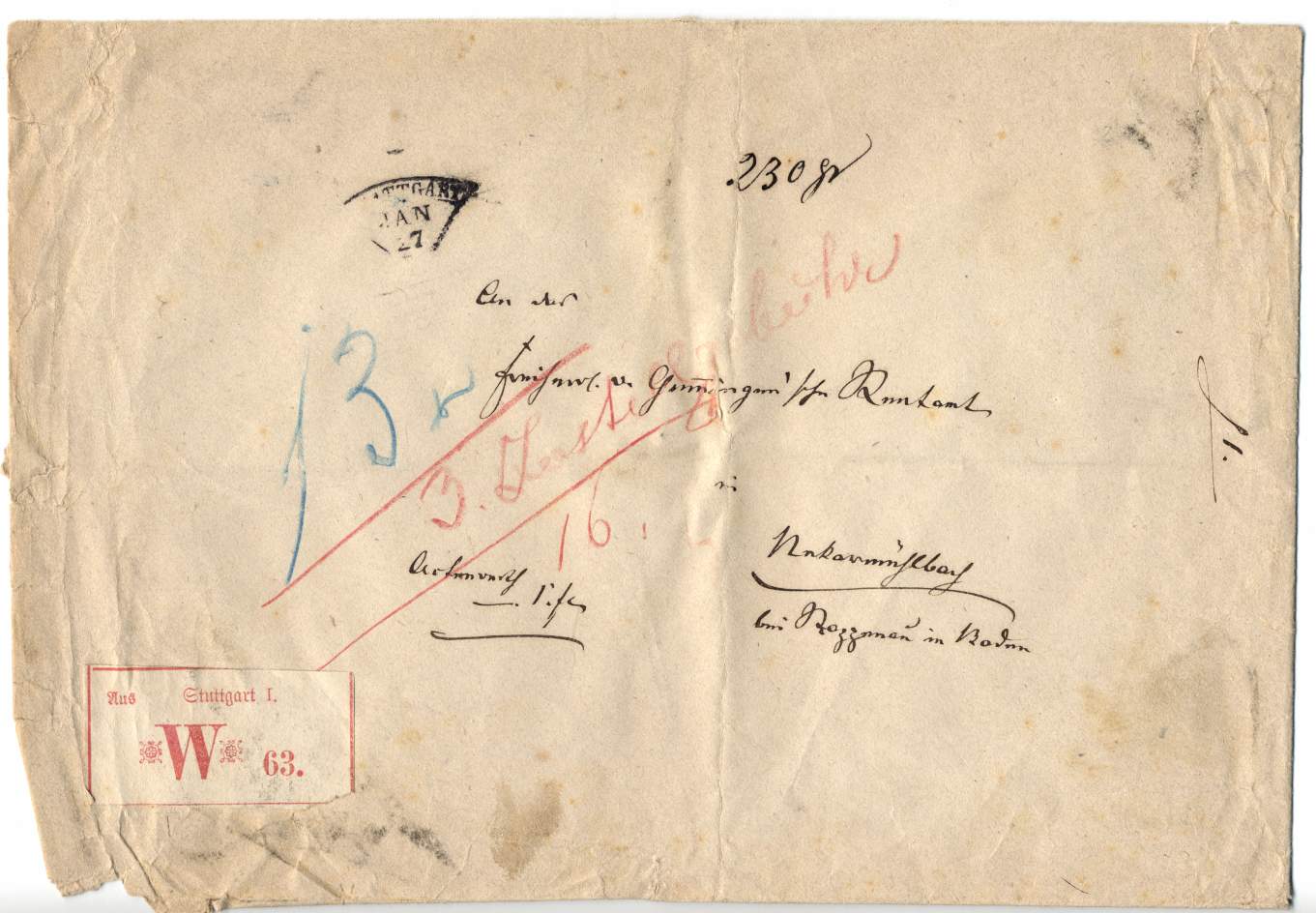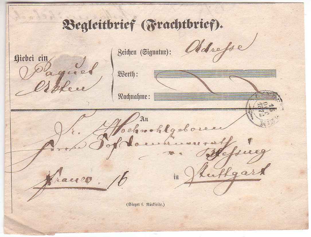 Paket vom 15 Dezember 1872 mit 13 Pfund Gewicht, von Bonfeld (Siegel Rentamt) nach Stuttgart.