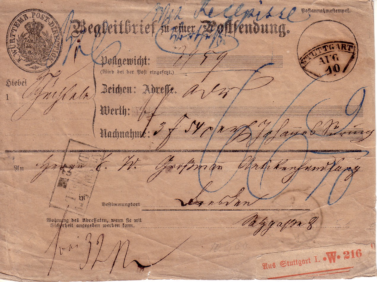 Paket-Begleitbrief (Frachtbrief) innerhalb Württembergs.