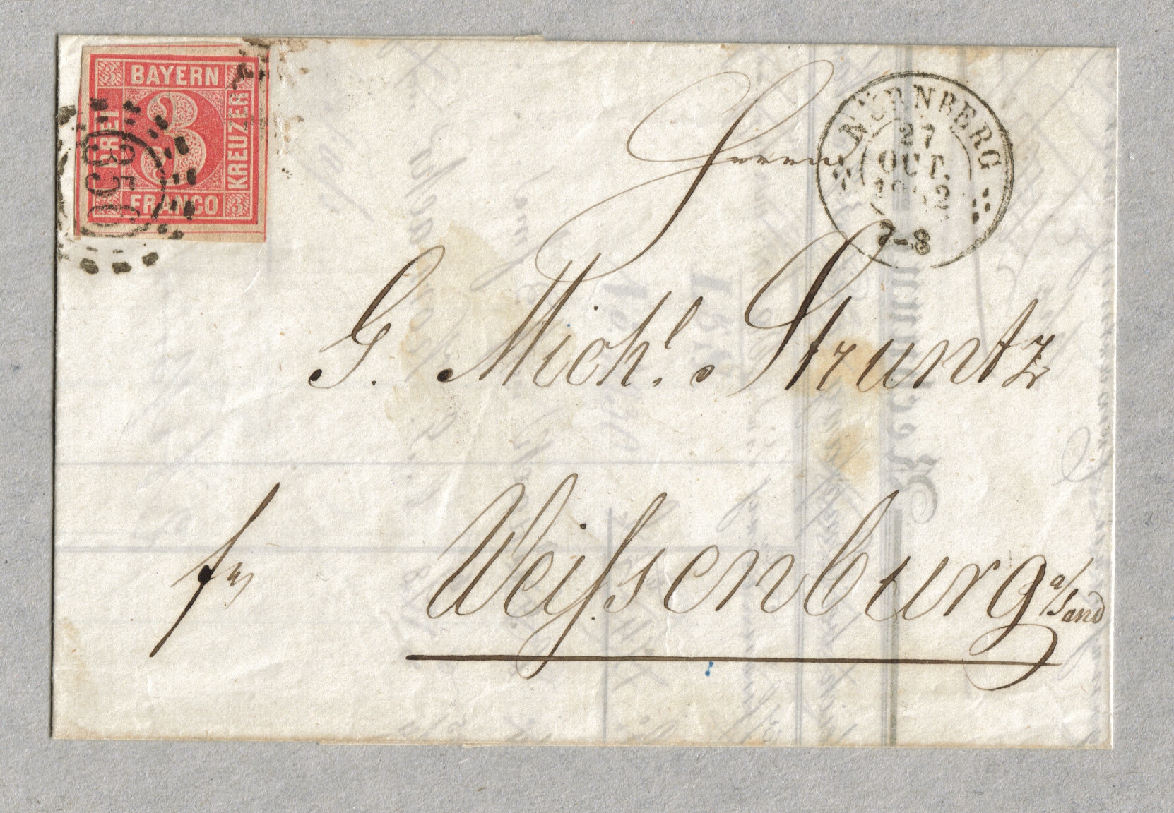 Fange mal an mit einer simplen Rechnung vom 27. Oktober 1862 von Nürnberg nach Weissenburg, frankiert mit der am 1.10.1862 verausgabten MiNr 9 (also gerade noch ein mikrokernscher Frühbeleg ;).