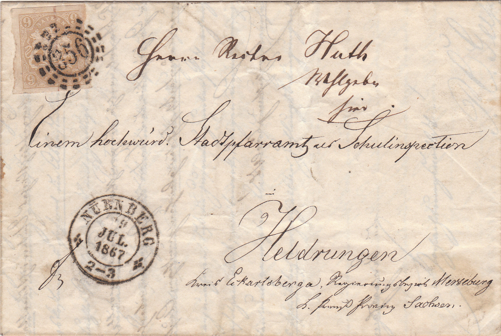 Bis 31.12.1867 bestand der Frankobetrag für Briefe bis ein Loth und in Postverein über 20 Meilen. Danach hätte der Brief nur 3 Kreuzer gekostet.