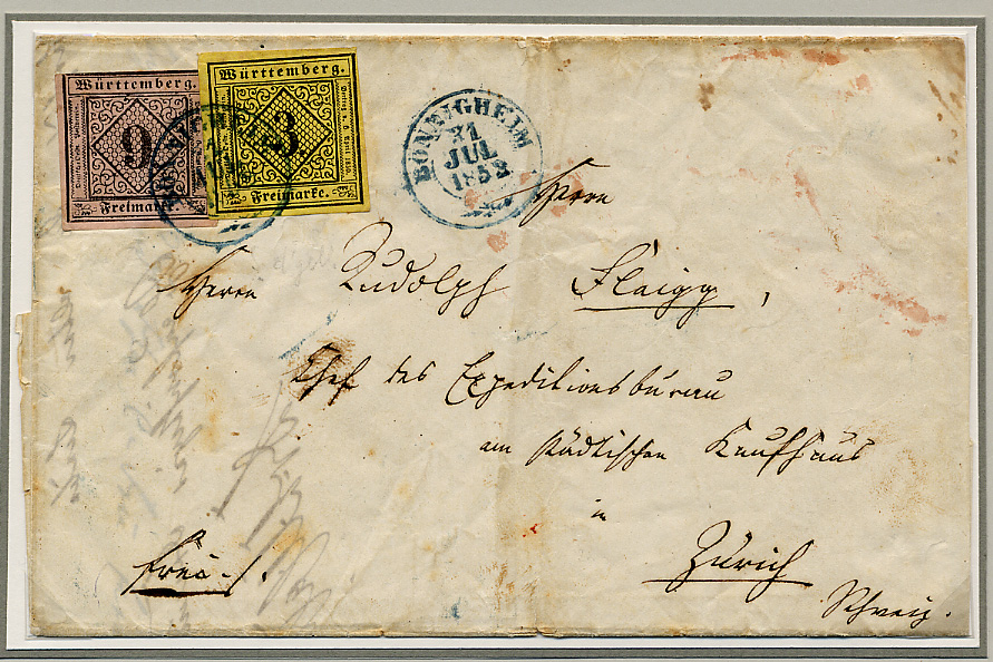 Sowie Brief von Ludwigsburg nach Schoenenwerth-Aarau frankiert mit Nr. 3 + 4