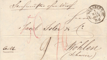 Ein Brief von Pforzheim nach Basel. Ganz anders als Bayern klassisch habe ich keine Gewichtsprobleme: so lange er mir nicht heftig widerspricht, bestimme ich das Porto wie folgt: 2. Postvereins-Rayon (6 Kreuzer) plus 1. Schweizer Rayon (3 Kreuzer) mal 2, da mehr als 1 Loth schwer = 18 Kreuzer.