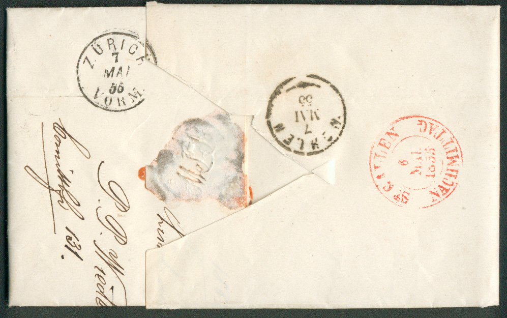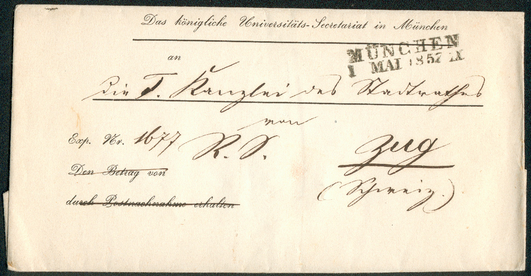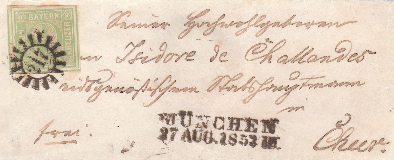 Beginnen möchte ich mit einem Brief der sogenannten geteilten Frankoabgeltung aus München vom 27.8.1853 nach Chur. Der Absender zahlte 9 Kr. (Marke) für den 3. Rayon Bayerns zur Schweiz und siegelseitig 6 Kr. Weiterfranko für die Schweiz in den 2. Rayon dort. Der Münchener Beamte musste hierzu nur in seiner Liste der Orte des 1. Rayons schauen, wo er Chur nicht fand. Daher musste es im 2. Rayon liegen und er 6 Kr. kassieren.