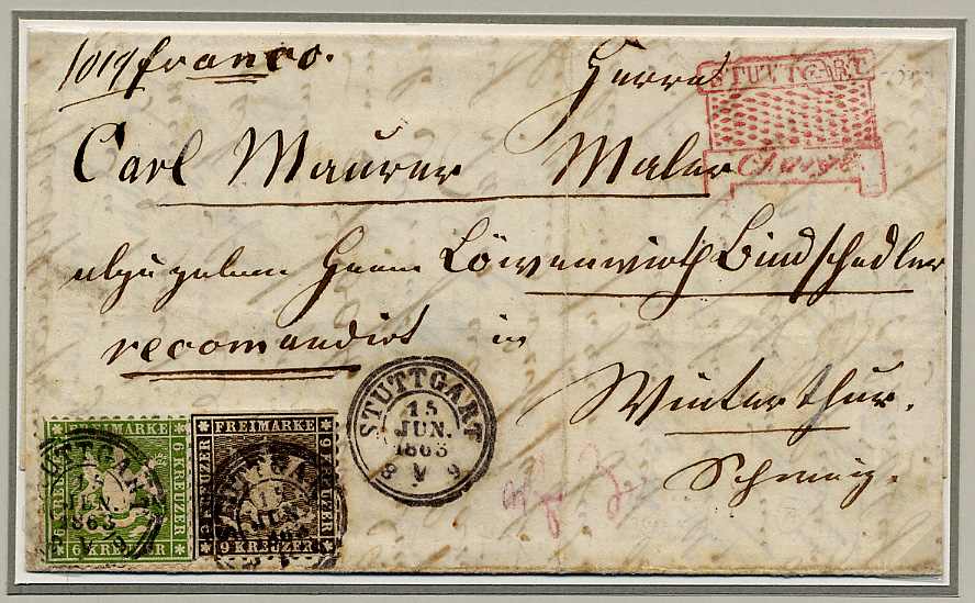 Anbei Brief von Stuttgart nach Sumiswald - Canton Bern frankiert mit 2 Mi.Nr. 25 = 12 Kreuzer - Weiterfrankovermerk 6 Kreuzer