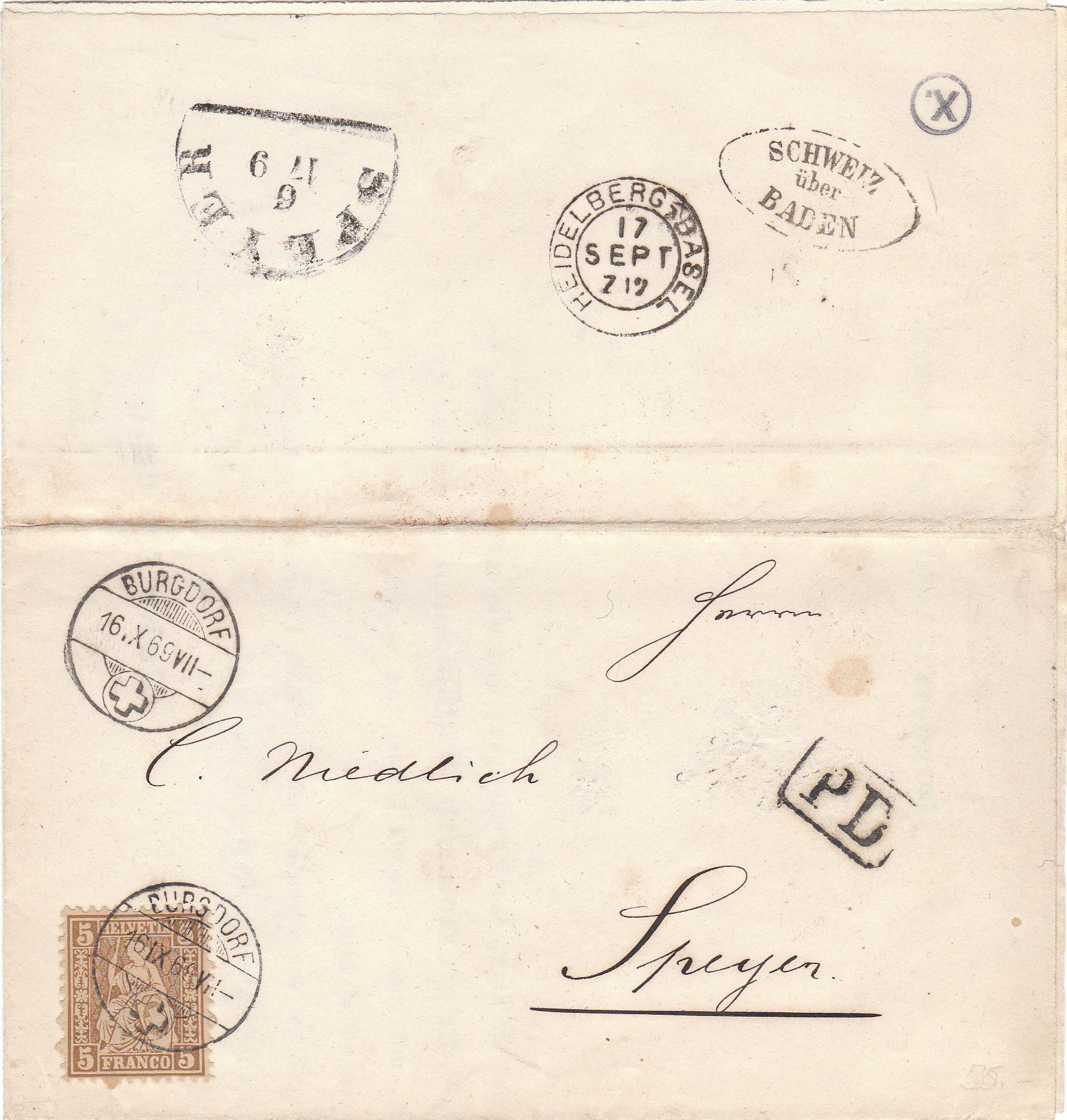 Die schönste CH Drucksache, die ich je gesehen habe, ging am 16.10.1869 ab Burgdorf über Baden nach Speyer. Wie schon geschildert, bekam Bayern hier gar nichts.