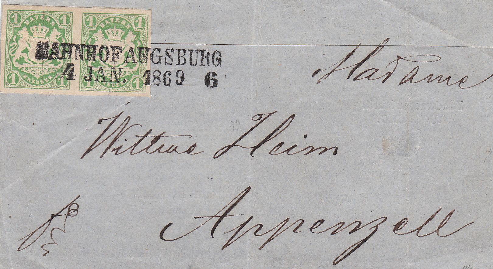Umgekehrt (ich hatte das Stück schon im Nr. 14 Thread gezeigt) lief eine Drucksache aus Augsburg vom 4.1.1869 nach Appenzell, die 33% teurer war, als ihr Schweizer Pendant.