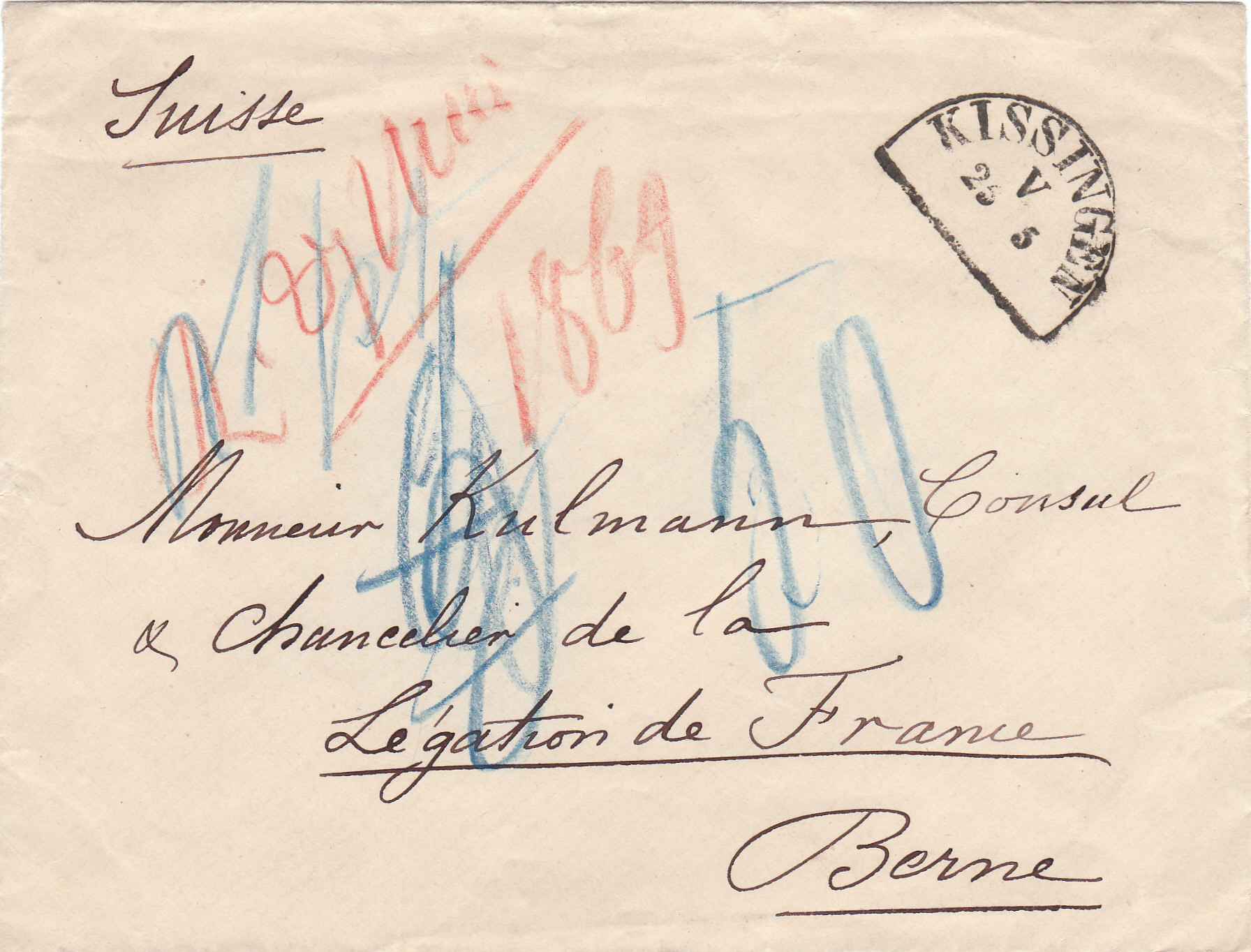 Ein Portobrief aus Kissingen vom 25.5.1869 an den Französischen Konsul in Bern, war teuer. Zuerst notierte man 2 Ports für die 2. Gewichtsstufe, korrigierte dann aber auf 1 Port und notierte 50 Rappen zutreffend. Alle Portobriefe ab dieser Vertragszeit sind selten.