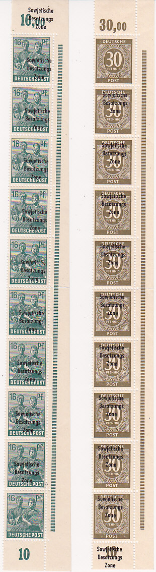 Ist der Aufdruck extrem verschoben, verbleibt in der ersten Bogen-Reihe nur "Sowjetische" bzw. in der letzten Bogenreihe nur "Zone" - im Bild 4. Reihe