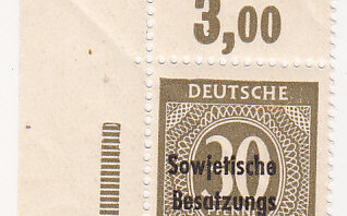 Dass die 30 Pfennig-Marke oben den seltenen durchgezähnten Oberrand hat, sei auch erwähnt - bleibt die Frage "Ist das die Alibes 928?" oder "ist das die SBZ 208?"