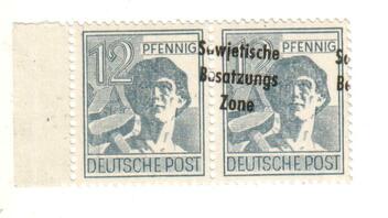 dann mache ich mal weiter mit verschobenen Aufdrucken, die nur Fragmente des Textes "Sowjetische Besatzungs Zone" auf der Marke zeigen.