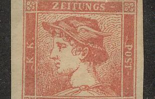 Die nächste Marke zeigt eine rosa Merkur (ebenfalls ein Neudruck). Trotz dem Mangel an Vergleichsstücken kann aber auch hier eindeutig festgestellt werden, daß es sich nicht um eine originale Merkur handelt. Man muß nur die Literatur gut genug lesen. Die gelben und rosa Merkure gibt es nur als Type Ib, die zinnoberroten als Type IIIb. Die abgebildeten Neudrucke weisen jedoch Abweichungen von den in Frage kommenden Typenmerkmalen auf. So z.b.: ein dickeres Z, welches eigentlich bei Type II Merkuren (die gibt es aber nur in blau) auftritt. Bei dem Rosa-Merkur-Neudruck ist zudem deutlich ein Querstrich im Ä zu erkennen, was eine Type Ib ausschließt. Tatsächlich sind die meisten Neudrucke der Merkure auch in Type II ausgeführt worden.