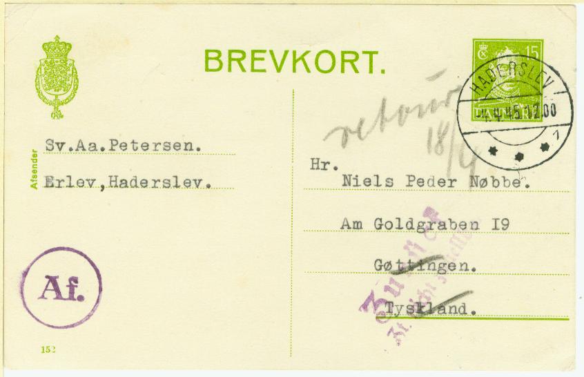 Sendet aus Haderslev am 4.4.1945 nach Göttingen. Gestempelt in Hamburg mit "Af" Durchlaufstempel Riemer Type 32.