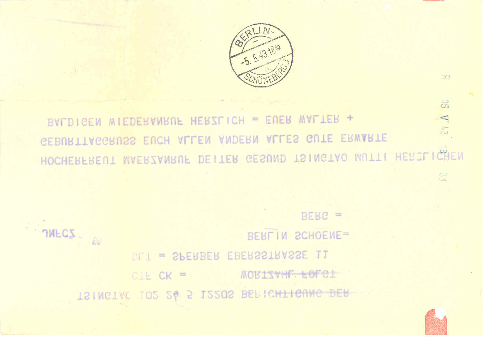 in Weiterführung des Beitrags "Fundgrube Zensurpost" möchte ich hier mal ein Auslandstelegramm aus Tsingtau (China) vom 5. 5. 43 vor-