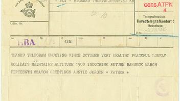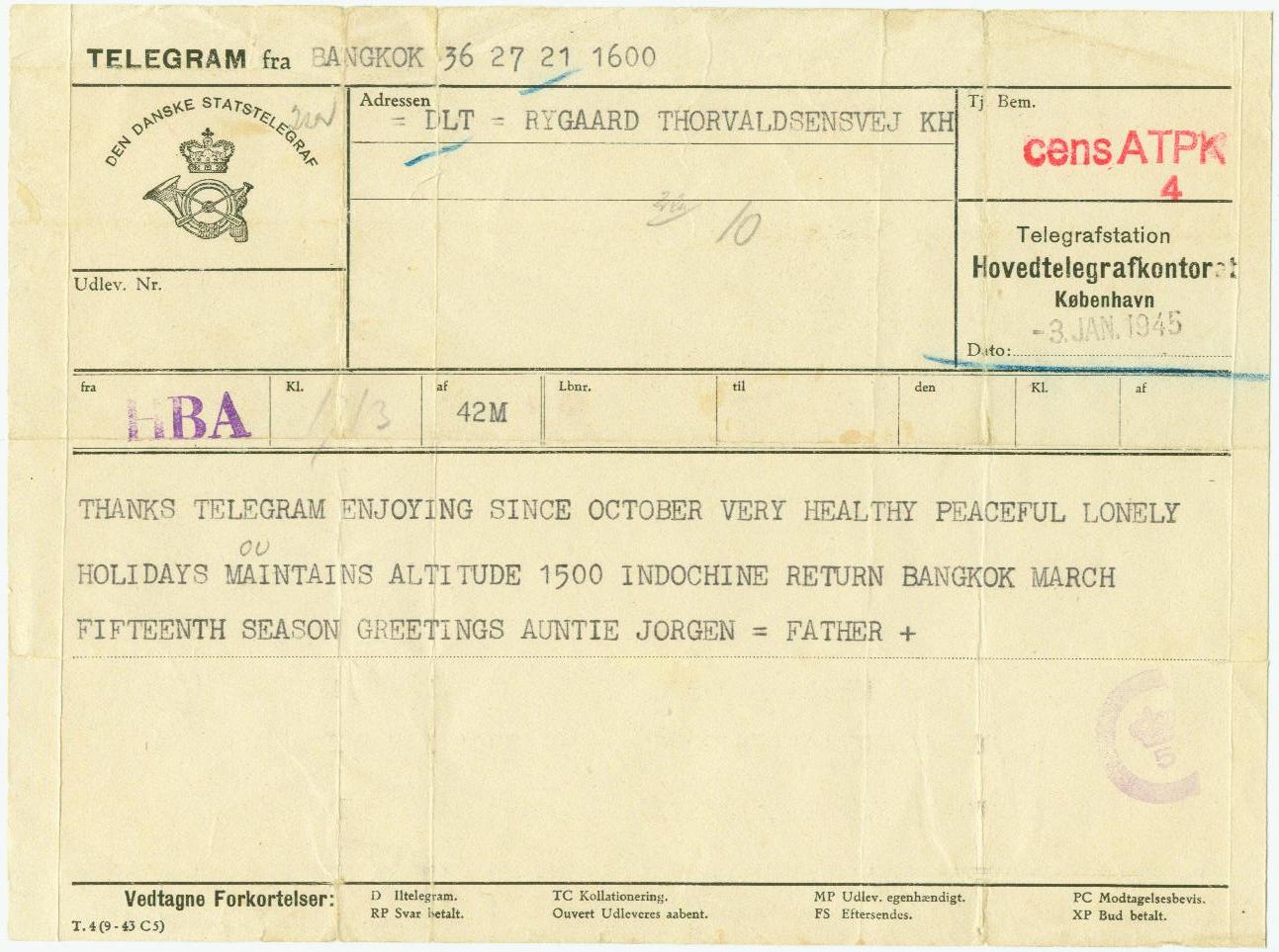 Schaue hier ein dänisches Telegram aus Bangkok nach Kopenhagen. Angekommen am 3. Jan. 1945.
