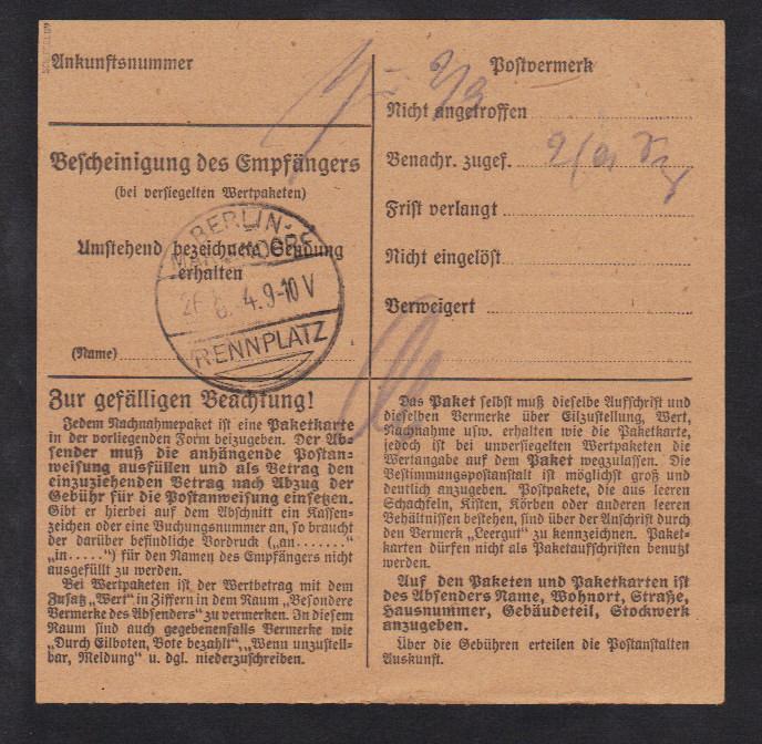 BERLIN-MARIENDORF RENNPLATZ 26.8.44 9-10V. --- also einige Zeit vor der normalen Entwertung --- und damals sollen die Beamten ihr "Werkzeug" ständig auf die aktuelle Zeit gestellt haben (heutzutage hat ja der Stempel wohl nur die Einstellung 18 Uhr - Feierabend)