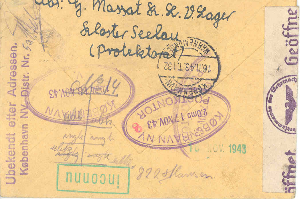 11. 11. 1943 in Seelau (B + M) als Eil-R-Brief nach Kopenhagen aufgegeben.