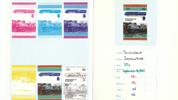 Phasendrucke sind recht unterhaltsam, um zu zeigen, wie das fertige Briefmarkenbild entsteht. Zu den beiden Maschinenproben des Herrn in der obersten Reihe hat Rainer im Thread "Essays" schon was gezeigt.