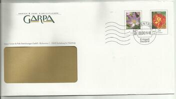 Die in Deutschland fällige Zustellgebühr in Höhe von 55 Cent wurde mit einer 55 Cent Blumenmarke beglichen und gestempelt: 07.07.2005 (Ersttag!)