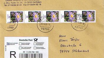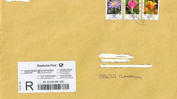 Heute in der Post ein Einschreiben mit Blumenmarken frankiert. Den Ausschnitt mit den Marken zeige ich hier.