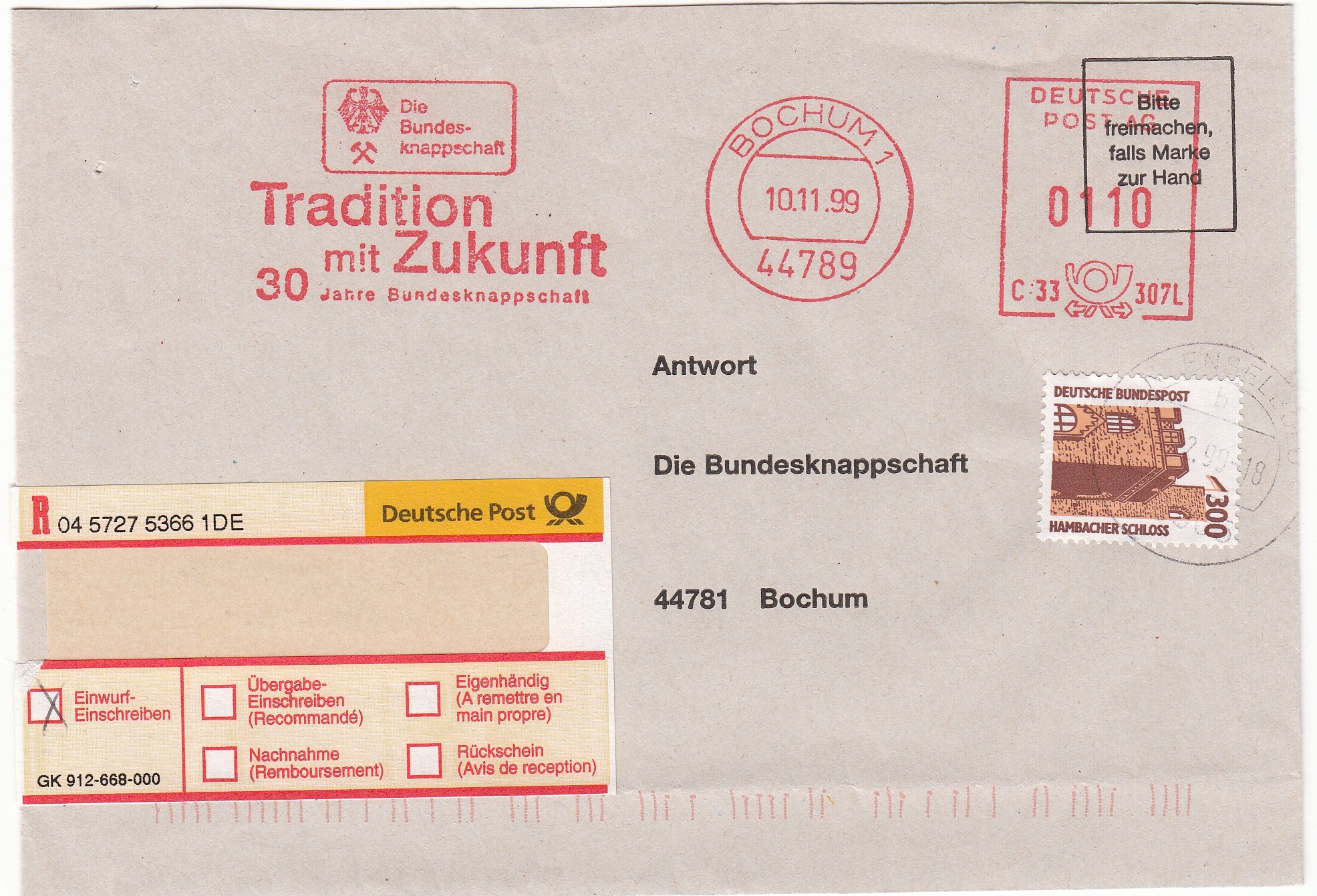 Der Brief wurde linearcodiert und lief nach Bochum.