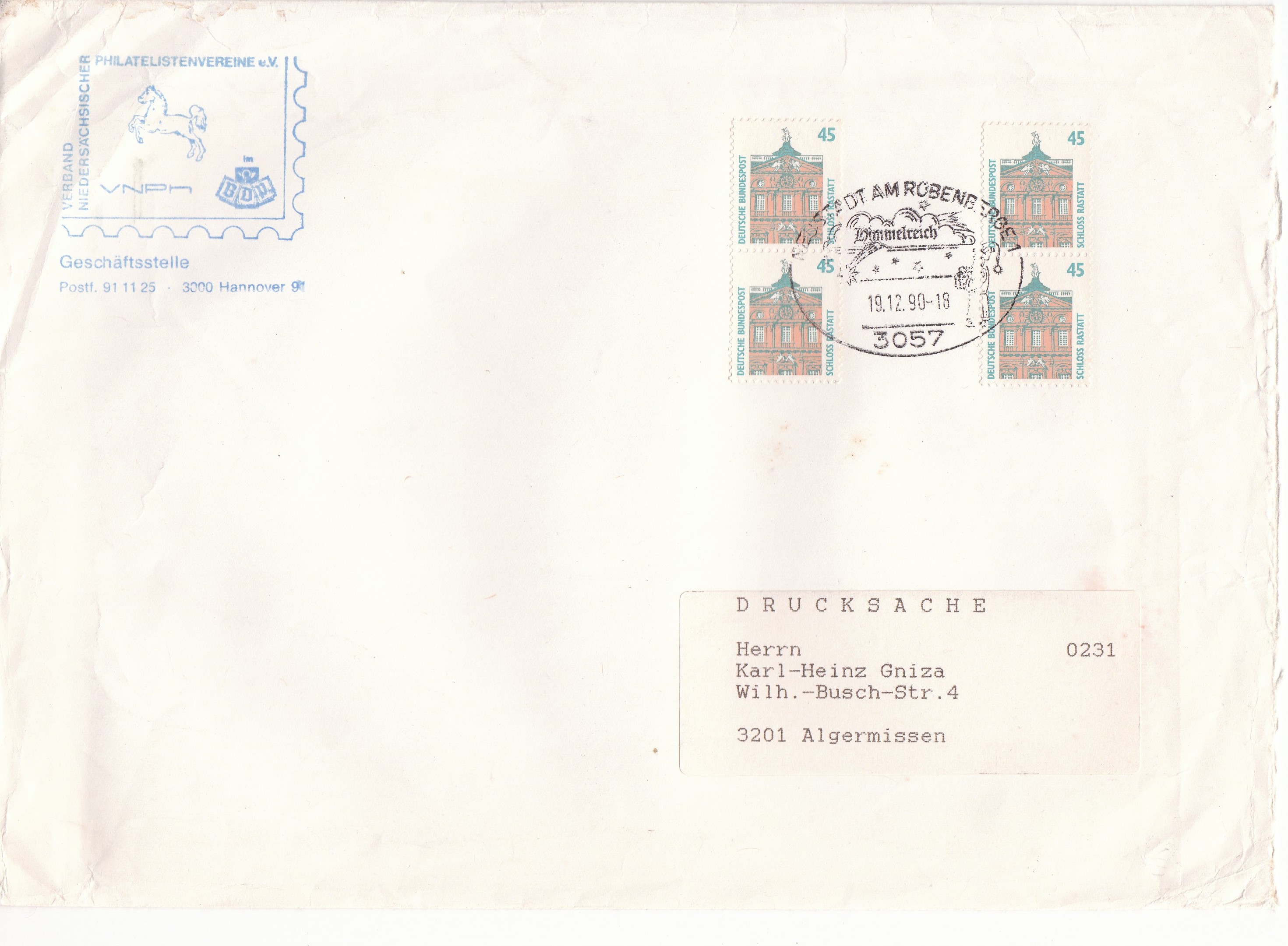 Die Entwertung erfolgte am 19.12.90 mit weihnachtsbezogenem Stempel "Himmelreich".