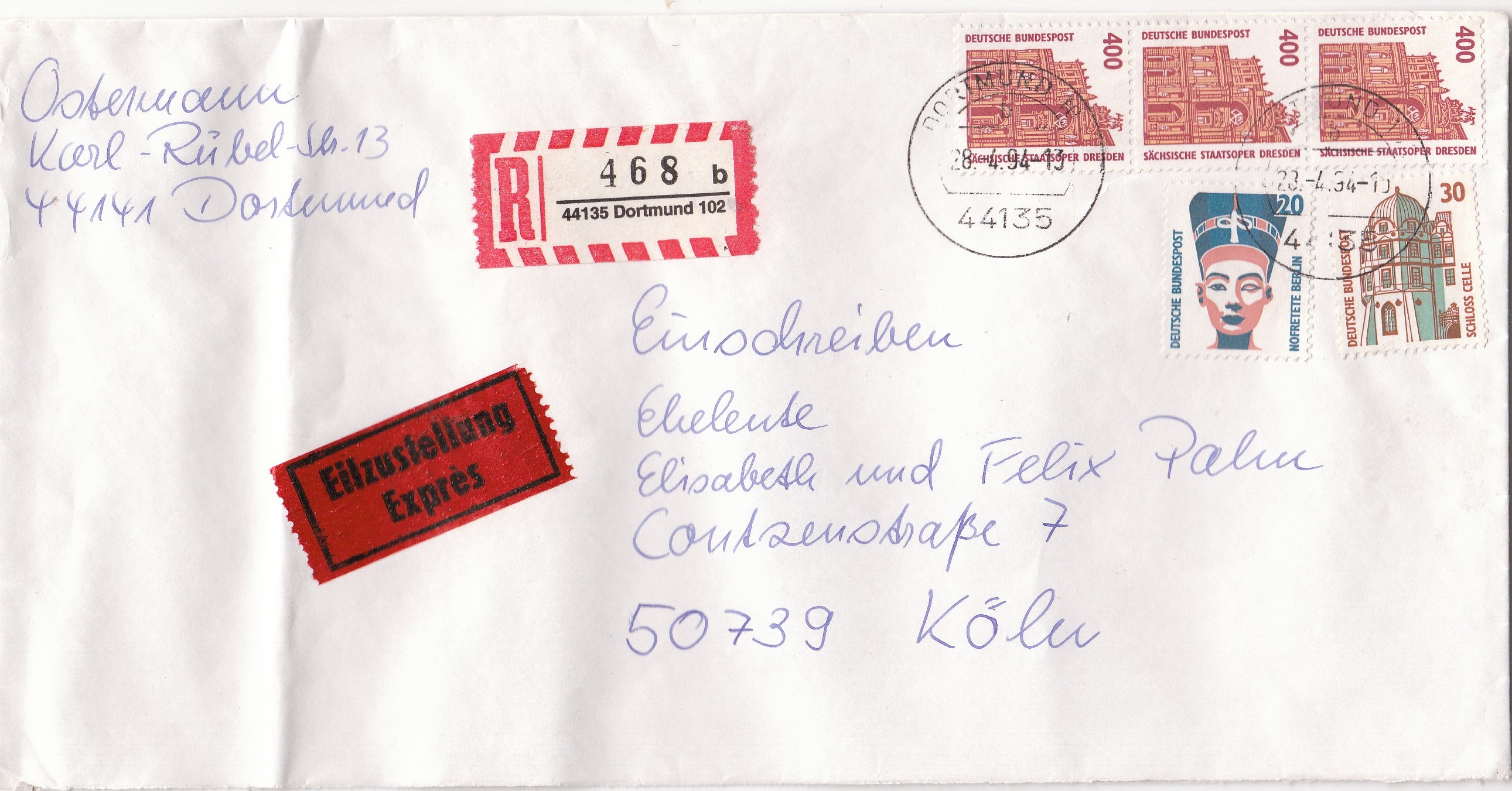 Rückseitig Handrollstempel Köln 1 vom 29.4.94 3 Uhr.