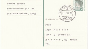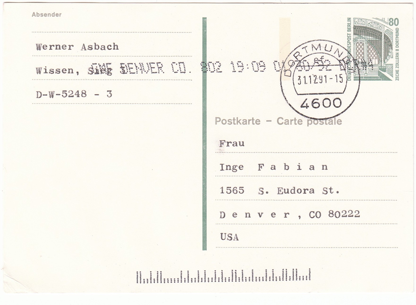 Berlin Ganzsache P 136 mit Eindruck des Wertstempels 80 Pf, portogerecht am 31.12.91 als Letzttag der Gültigkeit der Berlin-Ausgabe gelaufen in die USA nach Denver, Colorado mit entsprechender amerikanischer Linearcodierung sowie einer weiteren Codierung im Klartext.