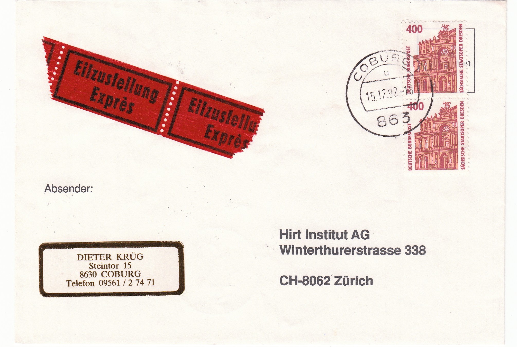 Rückseitig Stempel vom 16.12.92 10 Uhr von 8020 Zürich 1 Eilzustellung sowie vom 16.12.92 12 Uhr von 8050 Zürich 50 Oerlikon.