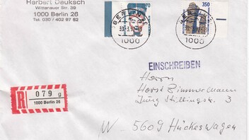 Brief von 21 bis 50 g, Postgebühr 170 Pf, per Einschreiben, Postgebühr 250 Pf, ergibt die Portostufe 420 Pf, hier portogerecht freigemacht mit zwei Marken der Dauerserie SWK, einem 350 Pf Wert mit rechtem Bogenrand sowie einem 70 Pf Wert mit linkem Bogenrand.