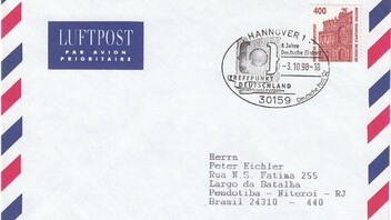 Brief (Welt), Luftpost, Postgebühr 400 Pf, hier portogerecht freigemacht als EF mit einem 400 Pf Wert der Dauerserie SWK, gestempelt am 3.10.98 in Hannover 1 und gelaufen nach Brasilien.