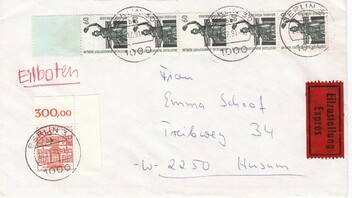 Machen wir also weiter mit einer MiF des 10 Pf Wertes SWK in der Version C, gleich oben ungezähnt aus Markenheftchen, mit einer Automatenmarke zu 100 Pf, die Portostufe 110 Pf abdeckend, die hier schon in reichlicher Anzahl gezeigt wurde, aber ein so blauer Brief wie dieser war noch nicht dabei!