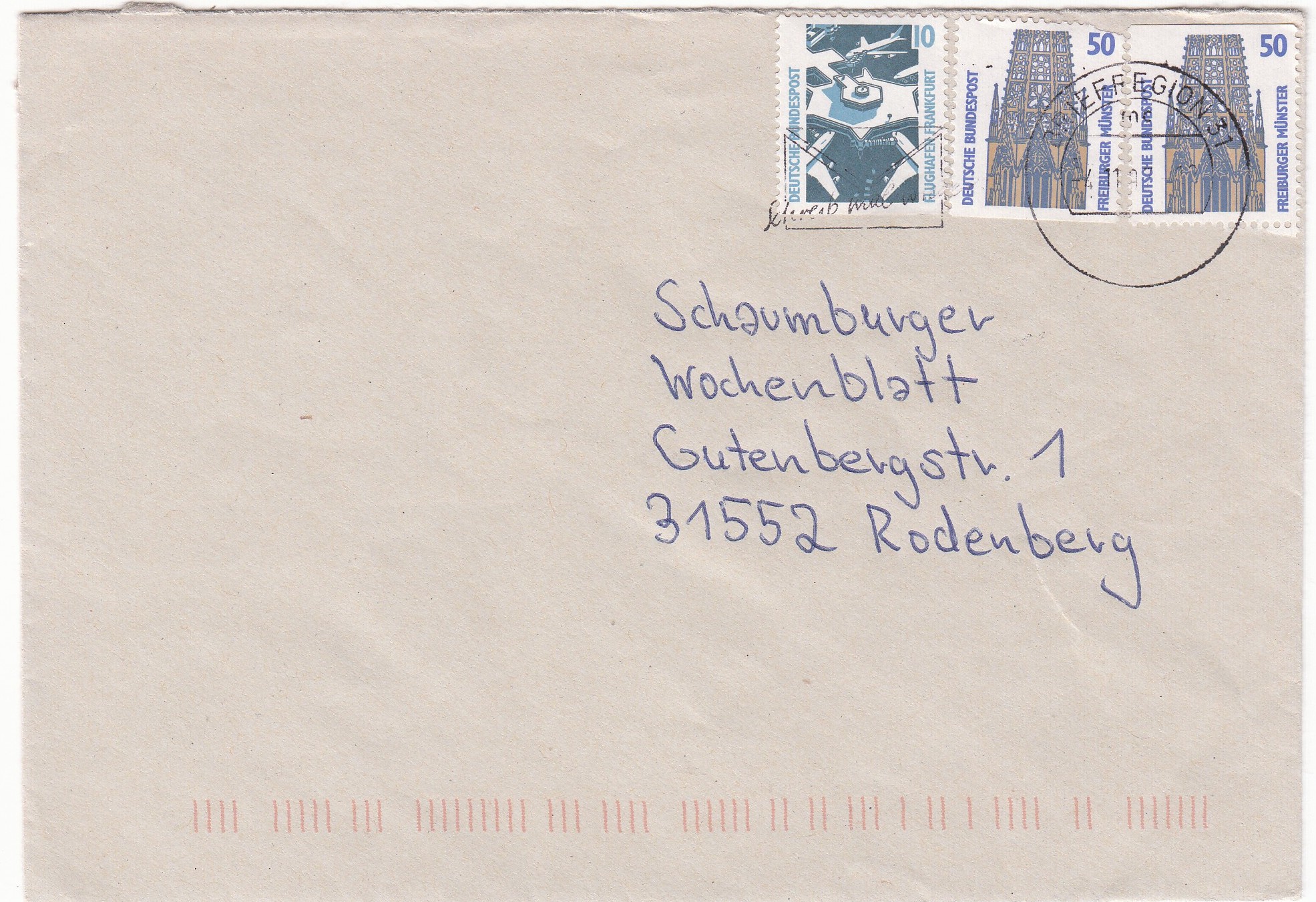 Brief von 21 bis 50 g, Postgebühr 220 Pf, hier freigemacht als MeF mit einem Zweierstreifen des 110 Pf Wertes, entwertet am 4.5.98 in Weilerswist, gelaufen an die Postfachadresse der Gasversorgung in 53871 Euskirchen mit entsprechender Linearcodierung.