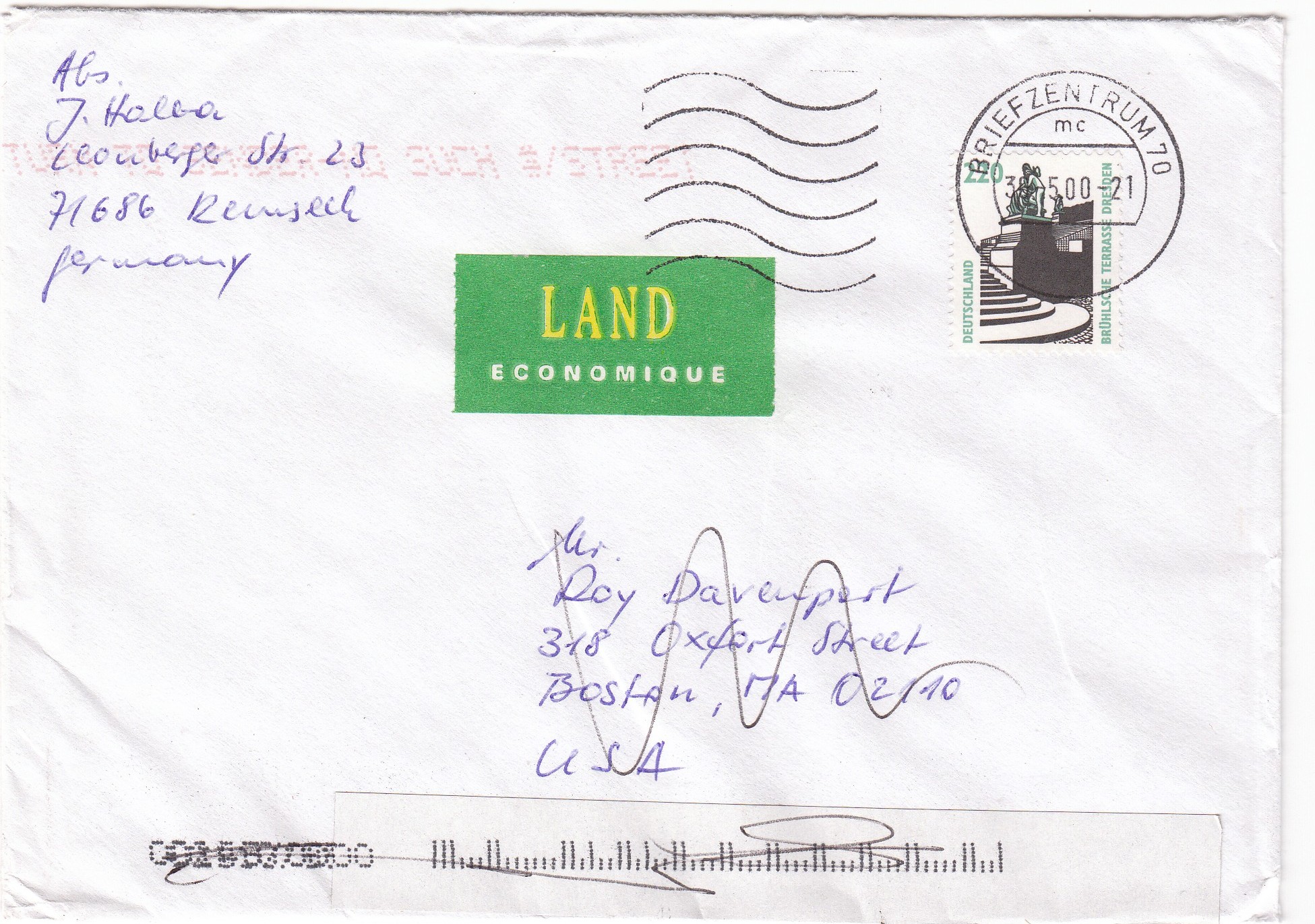 Kompaktbrief (Welt), Land von 21 - 50 g, Postgebühr 220 Pf, hier portogerecht freigemacht per EF des 220 Pf Wertes der Dauerserie SWK, entwertet am 30.5.00 mit Maschinenstempel mit Welleneinsatz BRIEFZENTRUM 70, adressiert nach Boston, USA, linearcodiert, Codierung abgeklebt und nochmals linearcodiert!???