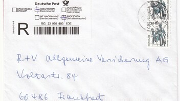 Der Brief wurde linearcodiert quer über den R-Klebezettel hinweg.