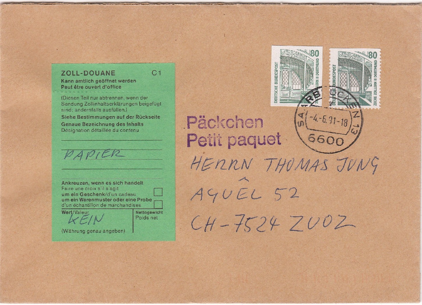 MiF von einem 80 Pf Wert selbstklebend sowie einem 80 Pf Wert oben ungezähnt aus MH, entwertet am 4.6.91 in Saarbrücken, adressiert in die Schweiz, linearcodiert, als "Päckchen" aufgegeben, mit grünem Zoll-Aufkleber.