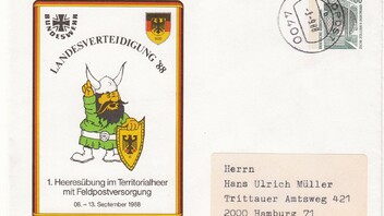 Brief mit Eindruck des 80 Pf Wertes und Zudruck zur "1. Heeresübung im Territorialheer mit Feldpostversorgung", die vom 08.-13. September 1988 lief, entwertet mit Tagesstempel "FELDPOST 4400" am 3.9.88.