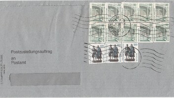 Postzustellungsauftrag, Postgebühr 1100 Pf, freigemacht als MiF mit lauter Ganzsachenausschnitten!