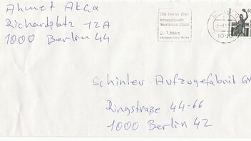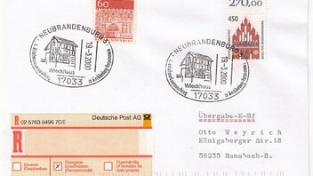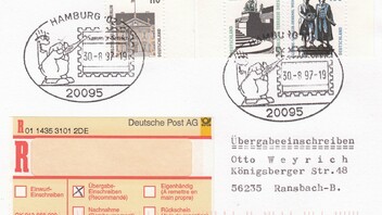 Interessant ist hier die PLZ-Kombination von "0-5069" des Absenders, "5010" im Einschreibe-Klebezettel, aber "502" im Tagesstempel vom ERFURT 1.