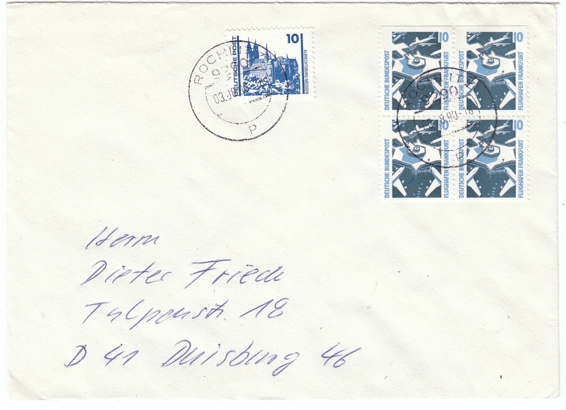 Standardbrief, Postgebühr 110 Pf, mit Wertangabe 1000.-, wofür die Behandlungsgebühr seit 1.7.96 1000 Pf betrug, ergibt die Portostufe 1110 Pf, hier portogerecht freigemacht als MiF, dabei Rand-Viererblock des 70 Pf Wertes SWK mit halber Formnummer "1" sowie Viererblock des 170 Pf Wertes SWK in Kombination mit einem 110 Pf Wert SWK sowie 2 Werten zu 20 Pf große Bauten, entwertet am 17.12.98.