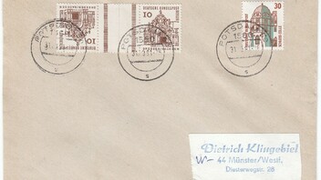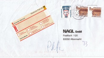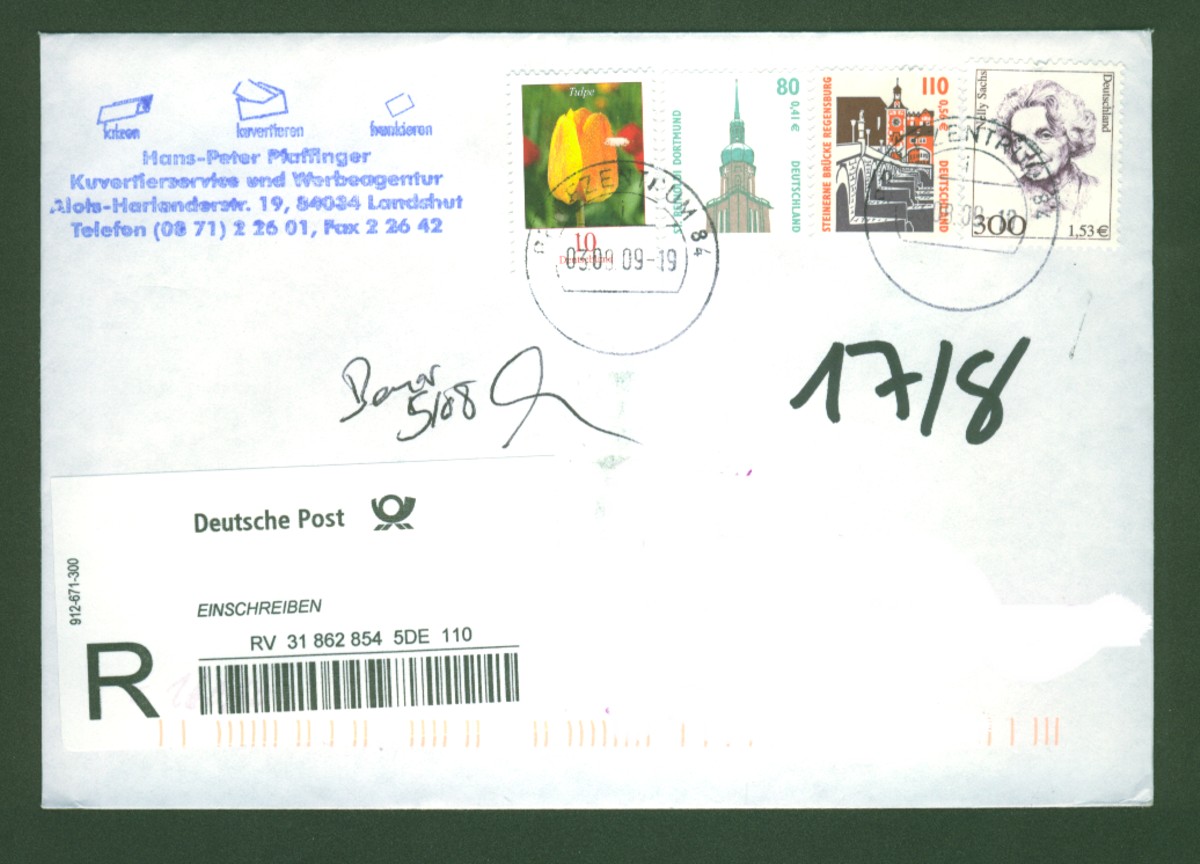 Eigentlich nix besonderes, aber der Absender hat eine nette Buntfrankatur aus Doppelnominalen SWK und Frauen produziert. Dazu klebt noch eine Blumenmarke zu 10 Cent auf dem Umschlag.