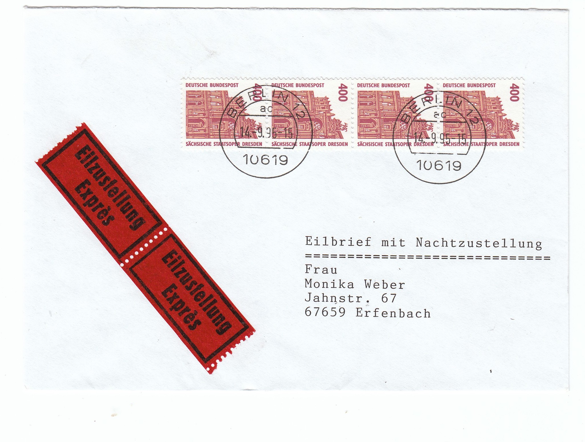 Die Entwertung erfolgte per Handstempel am 18.9.98, wobei die untere 300 Pf Marke nicht entwertet wurde.