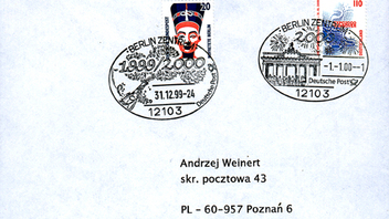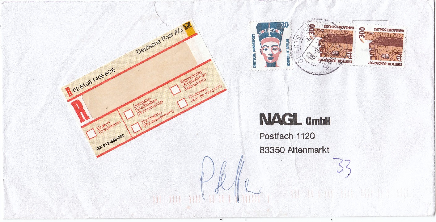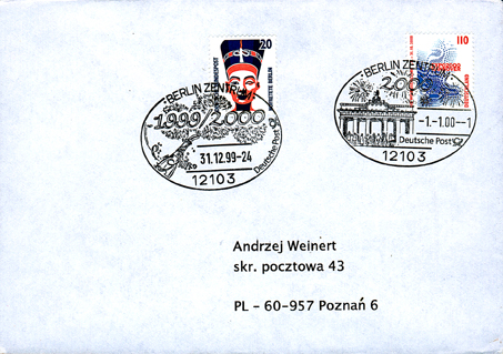 Am 1.1.2000 wurde der Brief dann portogerecht mit der 110 Pf Marke frankiert und aufgegeben und die 110 Pf Marke wurde entsprechend entwertet.