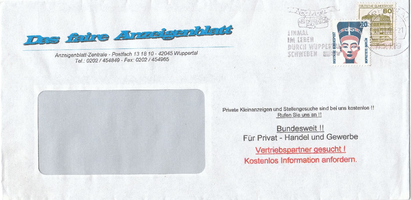 Standardbrief, Postgebühr 100 Pf, portogerecht frankiert mit einem 20 Pf Wert SWK sowie einem 80 Pf Wert B&S und entwertet per Maschinenstempel mit Werbeeinsatz am 19.11.96 in WUPPERTAL 1.