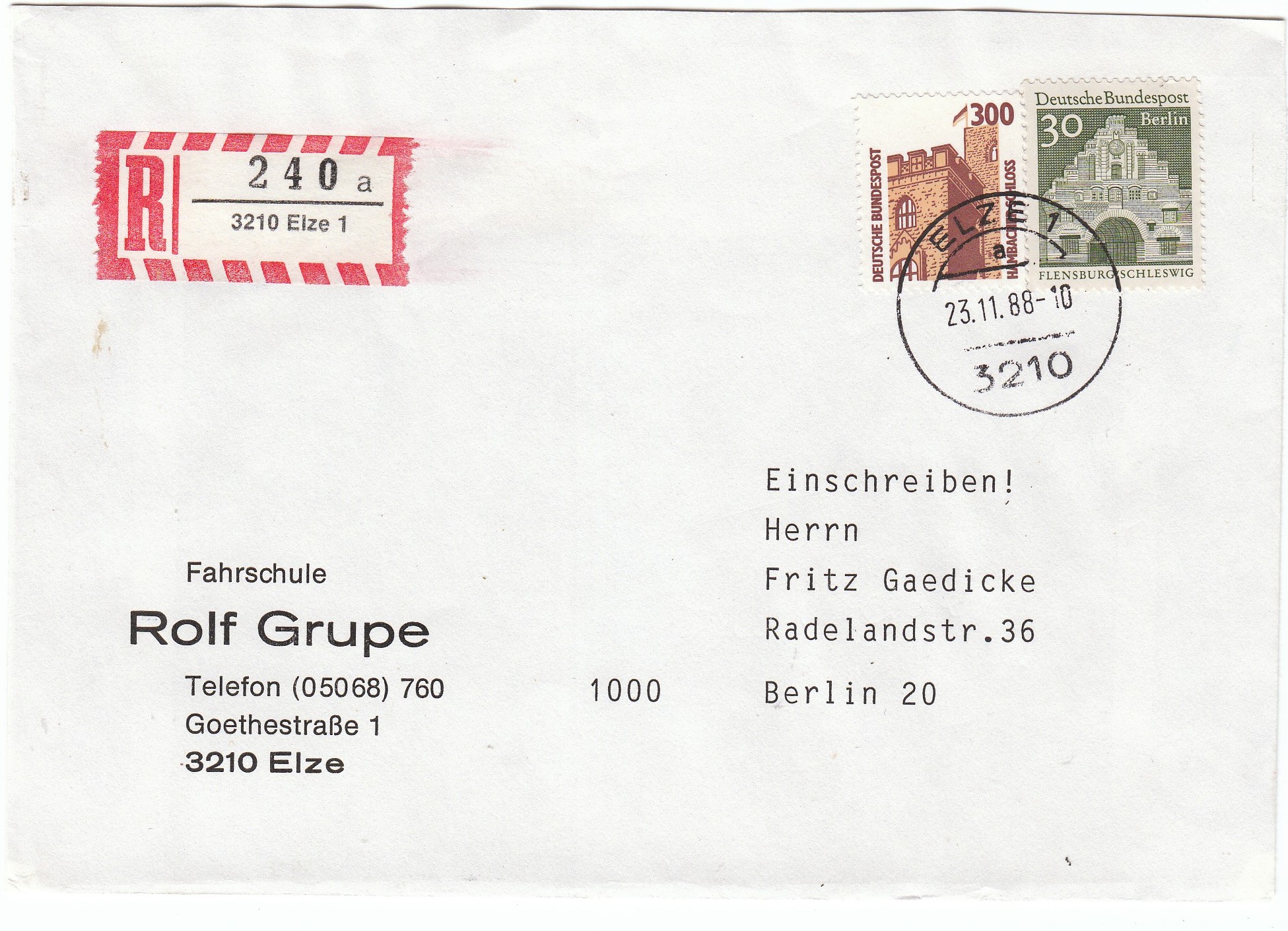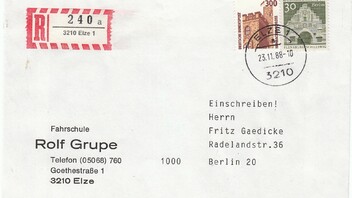 Brief der zweiten Gewichtsstufe von 21 bis 50 g, Postgebühr 130 Pf, per Einschreiben, Postgebühr 200 Pf, ergibt die Portostufe 330 Pf, hier portogerecht freigemacht mit einem 300 Pf Wert SWK sowie einem 30 Pf Wert große Bauten Ausgabe Berlin, entwertet am 23.11.88 in 3210 ELZE 1.